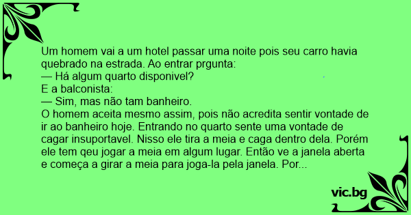 O homem aceita mesmo assim, pois não acredita sentir vontade de ir ao banheiro hoje. Entrando no quarto sente uma vontade de саgаr insuportavel. Nisso ele tira a meia e caga dentro dela. Porém ele tem qeu jogar a meia em algum lugar. Então ve a janela aberta e começa a girar a meia para joga-la pela janela. Por muita falta de sorte, a meia estava furada e saiu меrdа para todos os lados. Então o homem liga para o faxineiro do hotel. Quando o faxineiro chega o homem diz: