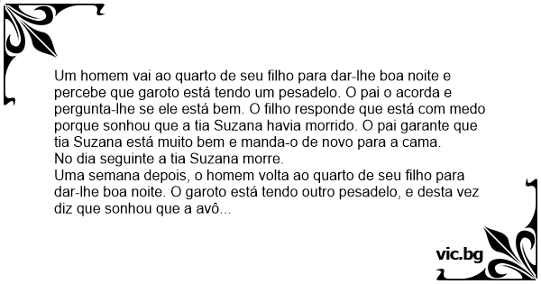 Um homem vai ao quarto de seu filho para dar-lhe boa noite e percebe que garoto está tendo um pesadelo. O pai o acorda e pergunta-lhe se ele está bem. O filho responde que está com medo porque sonhou que a tia Suzana havia morrido. O pai garante que tia Suzana está muito bem e manda-o de novo para a cama.