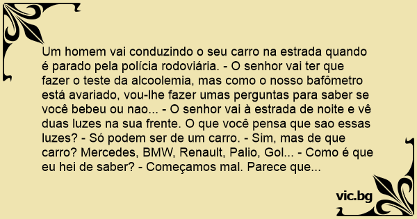 Um homem vai conduzindo o seu carro na estrada quando é parado pela polícia rodoviária. - O senhor vai ter que fazer o теsте da alcoolemia, mas como o nosso bafômetro está avariado, vou-lhe fazer umas perguntas para saber se você bebeu ou nao... - O senhor vai à estrada de noite e vê duas luzes na sua frente. O que você pensa que sao essas luzes? - Só podem ser de um carro. - Sim, mas de que carro? Mercedes, BMW, Renault, Palio, Gol... - Como é que eu hei de saber? - Começamos mal. Parece que o senhor nao vai passar no теsте. Pergunta seguinte. Você vai à estrada e vê somente uma luz vindo de frente. O que é essa luz? - Uma moto. - Sim, mas que moto? Kawasaki, Suzuki, Yamaha, Honda... - Mas como é que quer que eu saiba? - Bem, definitivamente, o seu теsте de alcoolemia vai dar positivo. O homem, já muito chateado, diz ao policial: