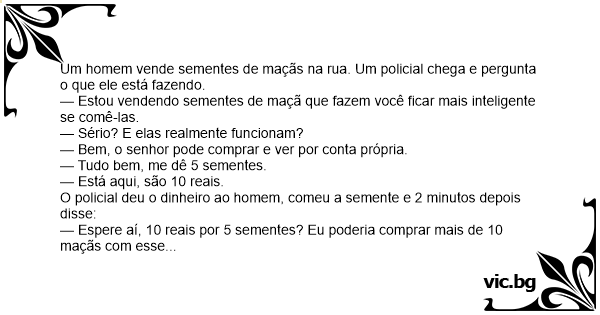 — Estou vendendo sementes de maçã que fazem você ficar mais inteligente se comê-las.