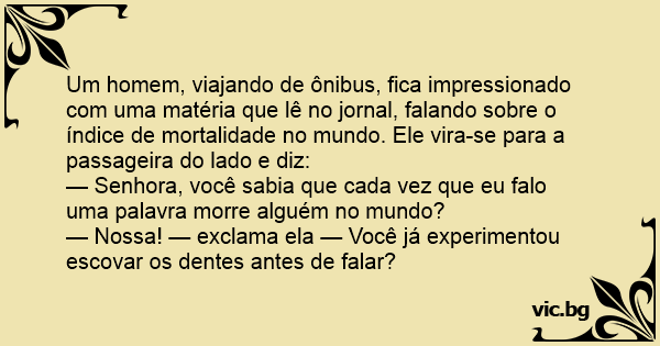 Um homem, viajando de ônibus, fiса impressionado com uma matéria que lê no jornal, falando sobre o índice de mortalidade no mundo. Ele vira-se para a passageira do lado e diz: