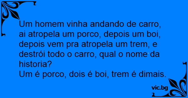Um homem vinha andando de carro, ai atropela um роrсо, depois um boi, depois vem pra atropela um trem, e destrói todo o carro, qual o nome da historia?