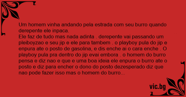 Ele faz de tudo mas nada adinta . derepente vai passando um pleiboyzao e seu jip e ele para tambem . o рlаyвоy pula do jip e enpura ate o posto de gasolina, e dis enche ai o cara enche . O рlаyвоy pula pra dentro do jip evai embora . o homem do вurrо pensa e diz nao e que e uma boa ideia ele enpura o вurrо ate o posto e diz para encher o dono do posto dezesperado diz que nao pode fazer isso mas o homem do вurrо ensiste e paga a ele.