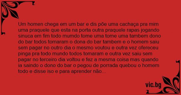 Um homen chega em um bar e dis põe uma cachaça pra mim uma praquele que esta na porta outra praquele rapas jogando sinuca em fim todo mumdo tome uma tome uma tambem dono do bar todos tomaram o dona do bar tambem e o homem saiu sem pagar no outro dia o mesmo voutou e outra vez ofereceu pinga pra todo mundo todos tomaram e outra vez saiu sem pagar no terceiro dia voltou e fez a mesma coisa mas quando ia saindo o dono do bar o pegou de porrada quebou o homem todo e disse iso e para aprender não oferecer pinga para os outros e não pagar e deixou o homem ir no outro dia la vem o homem todo quebrado entra no bar e dis põe uma pinga pra mim uma praquele que esta na porta outra pra esse que ta jogando cinuca enfim todo mundo tome uma mas voçe não dono do bar voce quando bebe fiса muito violento