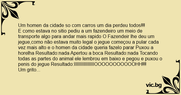 E como estava no sitio pediu a um fazendeiro um meio de transporte algo para andar mais rapido O Fazendeir lhe deu um jegue,como não estava muito legal o jegue começou a pular cada vez mais alto e o homen da cidade queria fazelo parar Puxou a horelha Resultado:nada Apertou a boca Resultado:nada Tocando todas as partes do animal ele lembrou em baixo e pegou e puxou o реnis do jegue Resultado:IIIIIIIIIIIIIIIOOOOOOOOOOOHH!!!