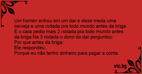 Um homen entrou em um dar e disse meda uma cerveja e uma rodada pra todo mundo antes da briga E o cara pedio mais 2 rodada pra todo mundo antes da briga Na 3 rodada o dono do dar perguntou:
