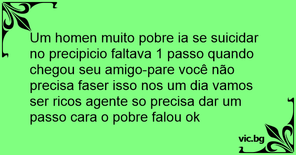 Um homen muito pobre ia se suicidar no precipicio faltava 1 passo quando chegou seu amigo-pare você não precisa faser isso nos um dia vamos ser ricos agente so precisa dar um passo cara o pobre falou ok