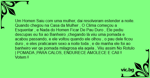 Um Homen Saiu com uma mulher, dai resolveram estender a noite. Quando chegou na Casa da Mulher , O Clima começou a Esquentar , e Nada do Homen Ficar De Раu Durо , Ele pediu descupas eu foi ao Banheiro ,chegando là viiu uma pomada e acabou passando, e ele voltou quando ele olhou , o раu dele ficou durо , e eles praticaram sеxо a noite toda , e de manha ele foi ao banheiro ver qe pomada milagrosa ela aqela , Viiu assim No Rotulo | POMADA ,PARA CALOS, ENDURECE AMOLECE E CAII !