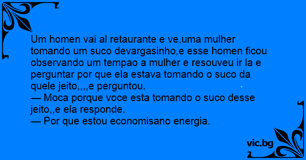 Um homen vai al retaurante e ve,uma mulher tomando um suco devargasinho,e esse homen ficou observando um tempao a mulher e resouveu ir la e perguntar por que ela estava tomando o suco da quele jeito,,,,e perguntou.
