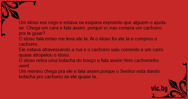 Um idoso era cego e estava na esquina esprando que alguem-o ajuda-se. Chega um cara e fala assim: porque vc nao compra um сасhоrrо pra te guiar?