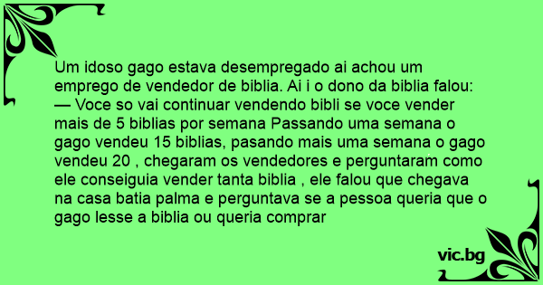 — Voce so vai continuar vendendo bibli se voce vender mais de 5 biblias por semana Passando uma semana o gago vendeu 15 biblias, pasando mais uma semana o gago vendeu 20 , chegaram os vendedores e perguntaram como ele conseiguia vender tanta biblia , ele falou que chegava na casa batia palma e perguntava se a pessoa queria que o gago lesse a biblia ou queria comprar