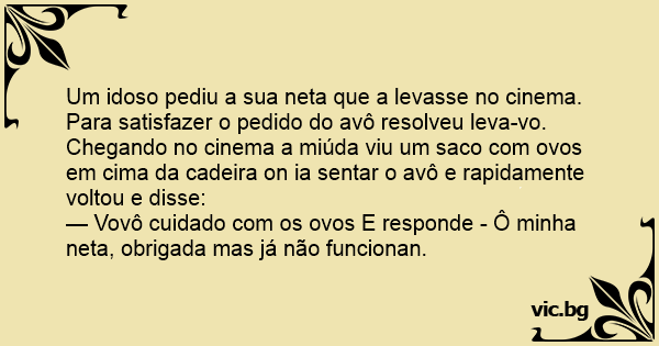 — Vovô cuidado com os ovos E responde - Ô minha neta, obrigada mas já não funcionan.