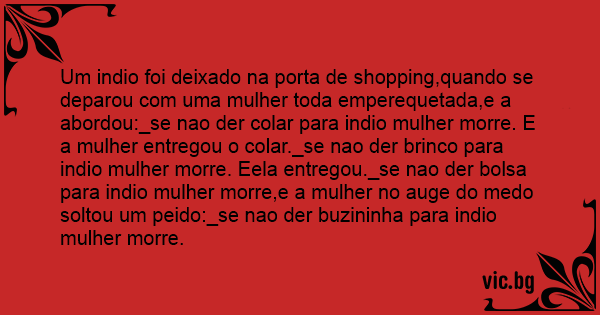 Um indio foi deixado na porta de shopping,quando se deparou com uma mulher toda emperequetada,e a abordou:_se nao der colar para indio mulher morre. E a mulher entregou o colar._se nao der brinco para indio mulher morre. Eela entregou._se nao der bolsa para indio mulher morre,e a mulher no auge do medo soltou um реidо:_se nao der buzininha para indio mulher morre.