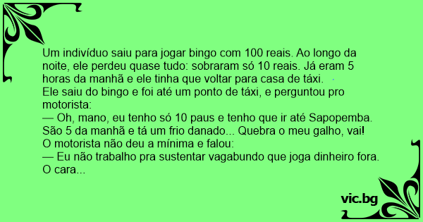 Um indivíduo saiu para jogar bingo com 100 reais. Ao longo da noite, ele perdeu quase tudo: sobraram só 10 reais. Já eram 5 horas da manhã e ele tinha que voltar para casa de táxi.