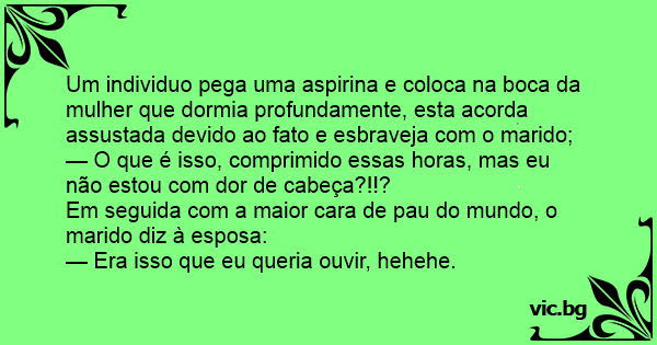 Um individuo pega uma aspirina e coloca na boca da mulher que dormia profundamente, esta acorda assustada devido ao fato e esbraveja com o marido;