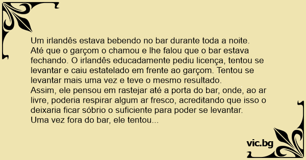 Até que o garçom o chamou e lhe falou que o bar estava fechando. O irlandês educadamente pediu licença, tentou se levantar e caiu estatelado em frente ao garçom. Tentou se levantar mais uma vez e teve o mesmo resultado.