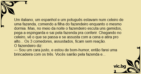 Um italiano, um espanhol e um potuguês estavam num celeiro de uma fazenda, comendo a filha do fazendeiro enquanto o mesmo dormia. Mas, no meio da noite o fazendeiro escuta uns gemidos, pega a espingarda e sai pela fazenda pra conferir. Chegando no celeiro, vê o que se passa e se assusta com a cena e atira pro alto... Os 3 comedores, assustados, ficam sem reação.