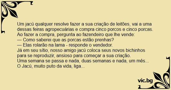 Um jacú qualquer resolve fazer a sua criação de leitões, vai a uma dessas feiras agropecuárias e compra cinco porcos e cinco porcas.