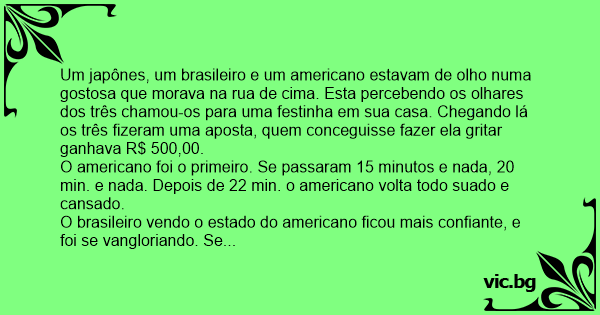 Um japônes, um brasileiro e um americano estavam de olho numa gostosa que morava na rua de cima. Esta percebendo os olhares dos três chamou-os para uma festinha em sua casa. Chegando lá os três fizeram uma aposta, quem conceguisse fazer ela gritar ganhava R$ 500,00.