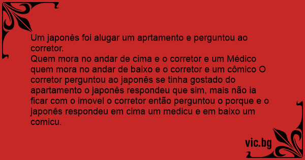 Quem mora no andar de cima e o corretor e um Médico quem mora no andar de baixo e o corretor e um cômico O corretor perguntou ao japonês se tinha gostado do apartamento o japonês respondeu que sim, mais não ia ficar com o imovel o corretor então perguntou o porque e o japonês respondeu em cima um medicu e em baixo um comicu.