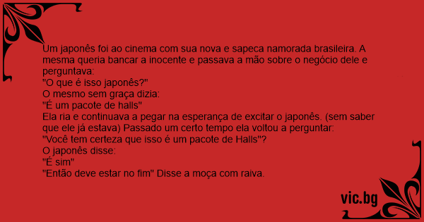 Um japonês foi ao cinema com sua nova e sapeca namorada brasileira. A mesma queria bancar a inocente e passava a mão sobre o negócio dele e perguntava:
