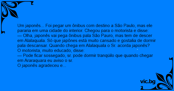 — Olha, japonês vai pega ônibus pala São Pauro, mas tem de descer em Alalaquala. Só que japônes está muito cansado e gostalia de dormir pala descansar. Quando chega em Alalaquala o Sr. acorda japonês?