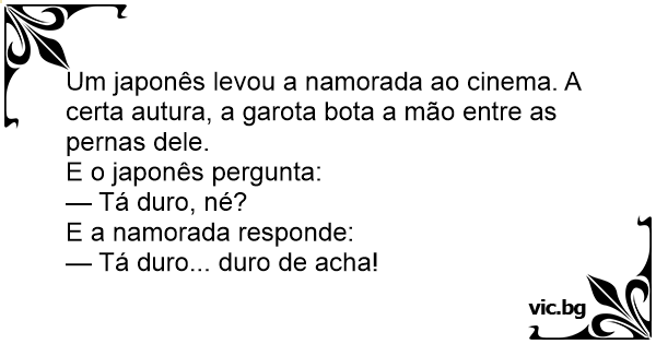 Um japonês levou a namorada ao cinema. A certa autura, a garota bota a mão entre as pernas dele.