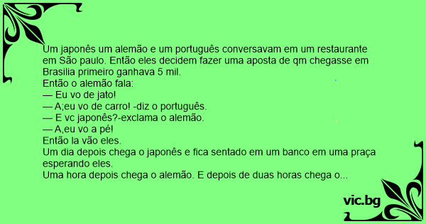 Um japonês um alemão e um português conversavam em um restaurante em São paulo. Então eles decidem fazer uma aposta de qm chegasse em Brasilia primeiro ganhava 5 mil.