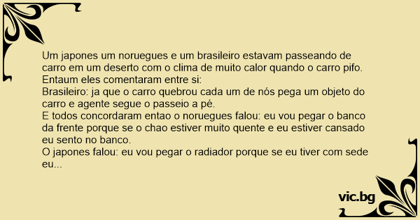 Um japones um noruegues e um brasileiro estavam passeando de carro em um deserto com o clima de muito calor quando o carro pifo.