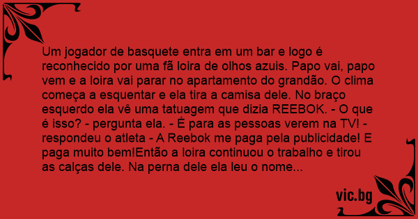 Um jogador de basquete entra em um bar e logo é reconhecido por uma fã loira de olhos azuis. Papo vai, papo vem e a loira vai parar no apartamento do grandão. O clima começa a esquentar e ela tira a camisa dele. No braço esquerdo ela vê uma tatuagem que dizia REEBOK. - O que é isso? - pergunta ela. - É para as pessoas verem na TV! - respondeu o atleta - A Reebok me paga pela publicidade! E paga muito bem!Então a loira continuou o trabalho e tirou as calças dele. Na perna dele ela leu o nome NIKE tatuado e voltou a perguntar: