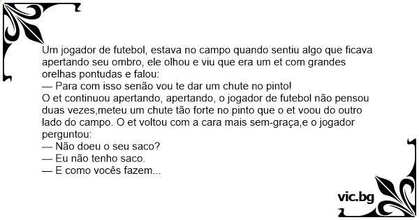 O et continuou apertando, apertando, o jogador de futebol não pensou duas vezes,meteu um chute tão forte no pinto que o et voou do outro lado do campo. O et voltou com a cara mais sem-graça,e o jogador perguntou: