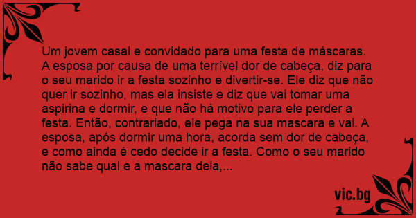 Um jovem casal e convidado para uma festa de máscaras. A esposa por causa de uma terrível dor de cabeça, diz para o seu marido ir a festa sozinho e divertir-se. Ele diz que não quer ir sozinho, mas ela insiste e diz que vai tomar uma aspirina e dormir, e que não há motivo para ele perder a festa. Então, contrariado, ele pega na sua mascara e vai. A esposa, após dormir uma hоrа, acorda sem dor de cabeça, e como ainda é cedo decide ir a festa. Como o seu marido não sabe qual e a mascara dela, ela acha que vai ser uma boa oportunidade de observar como e que o seu marido se comporta quando ela não esta por perto. Ela chega a festa e vê logo o seu marido mascarado na pista de dança com uma mulher muito bonita, pegando aqui e beijando ali. A mulher arranja maneira de se insinuar para que ele largue a outra. Ela deixa-o ir ate onde ele quer porque, afinal, ele e seu marido. Finalmente, ele sussurra alguma coisa em seu ouvido e ela concorda. Vão para o carro e fazem amor como uns loucos, duas, três, quatro vezes, sempre sem tirarem as mascaras. Depois separam-se e ela vai para casa, sem se revelar, e volta para a cama imaginando qual será a explicação que ele dará sobre o seu comportamento na festa. Quando ele chega ela esta a ler um livro na cama e pergunta-lhe: