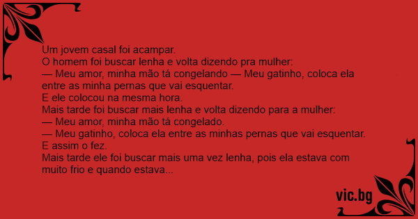 — Meu amor, minha mão tá congelando — Meu gatinho, coloca ela entre as minha pernas que vai esquentar.