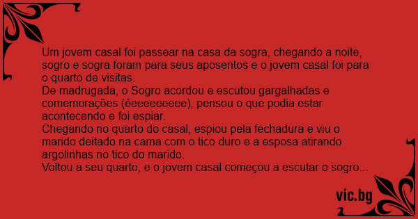 Um jovem casal foi passear na casa da sogra, chegando a noite, sogro e sogra foram para seus aposentos e o jovem casal foi para o quarto de visitas.