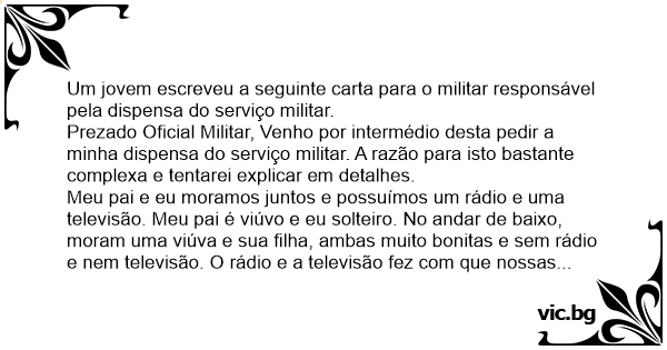 Um jovem escreveu a seguinte carta para o militar responsável pela dispensa do serviço militar.