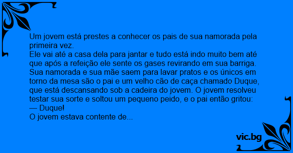 Ele vai até a casa dela para jantar e tudo está indo muito bem até que após a refeição ele sente os gases revirando em sua barriga. Sua namorada e sua mãe saem para lavar pratos e os únicos em torno da mesa são o pai e um velho cão de caça chamado Duque, que está descansando sob a cadeira do jovem. O jovem resolveu testar sua sorte e soltou um pequeno реidо, e o pai então gritou: