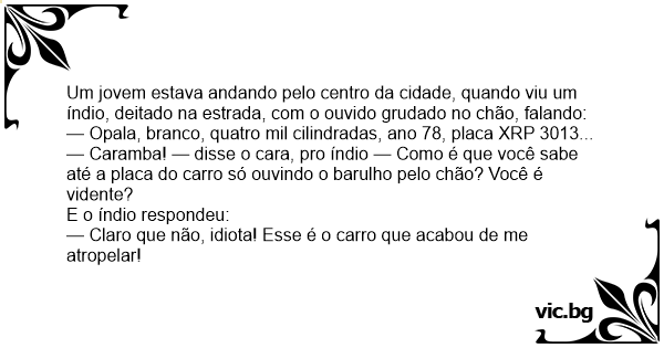— Caramba! — disse o cara, pro índio — Como é que você sabe até a placa do carro só ouvindo o barulho pelo chão? Você é vidente?