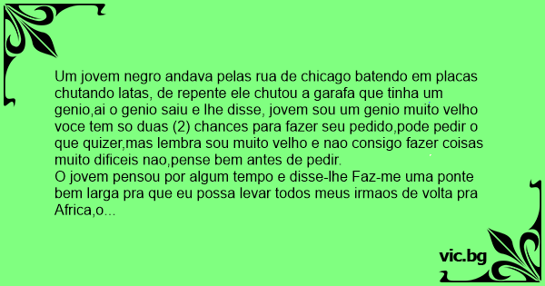 Um jovem nеgrо andava pelas rua de chicago batendo em placas chutando latas, de repente ele chutou a garafa que tinha um genio,ai o genio saiu e lhe disse, jovem sou um genio muito velho voce tem so duas (2) chances para fazer seu pedido,pode pedir o que quizer,mas lembra sou muito velho e nao consigo fazer coisas muito dificeis nao,pense bem antes de pedir.