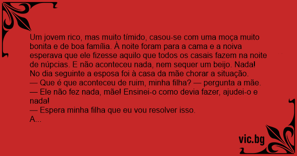 Um jovem rico, mas muito tímido, casou-se com uma moça muito bonita e de boa família. À noite foram para a cama e a noiva esperava que ele fizesse aquilo que todos os casais fazem na noite de núpcias. E não aconteceu nada, nem sequer um beijo. Nada! No dia seguinte a esposa foi à casa da mãe chorar a situação.