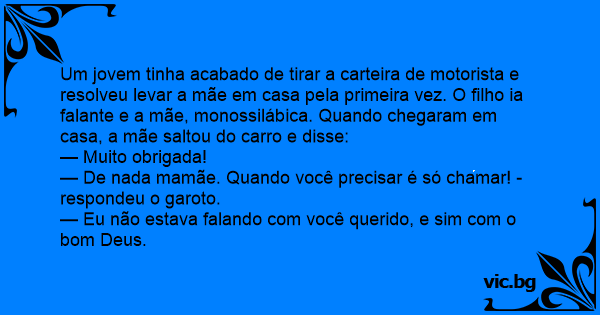 Um jovem tinha acabado de tirar a carteira de motorista e resolveu levar a mãe em casa pela primeira vez. O filho ia falante e a mãe, monossilábica. Quando chegaram em casa, a mãe saltou do carro e disse: