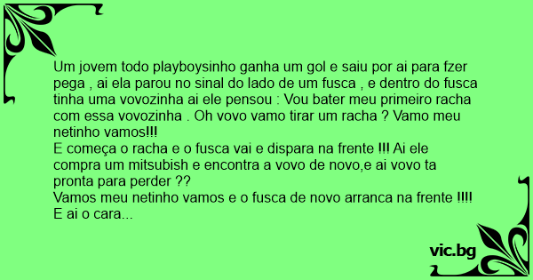Um jovem todo playboysinho ganha um gol e saiu por ai para fzer pega , ai ela parou no sinal do lado de um fusca , e dentro do fusca tinha uma vovozinha ai ele pensou : Vou bater meu primeiro racha com essa vovozinha . Oh vovo vamo tirar um racha ? Vamo meu netinho vamos!!!