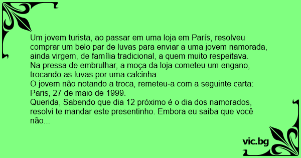 Um jovem turista, ao passar em uma loja em París, resolveu comprar um belo par de luvas para enviar a uma jovem namorada, ainda virgem, de família tradicional, a quem muito respeitava.