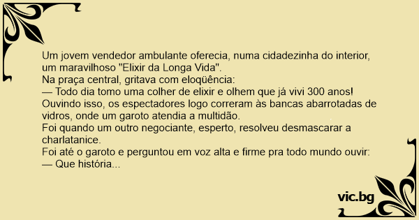 Um jovem vendedor ambulante oferecia, numa cidadezinha do interior, um maravilhoso "Elixir da Longa Vida".