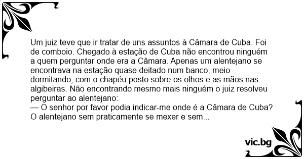 Um juiz teve que ir tratar de uns assuntos à Câmara de Cuba. Foi de comboio. Chegado à estação de Cuba não encontrou ninguém a quem perguntar onde era a Câmara. Apenas um alentejano se encontrava na estação quase deitado num banco, meio dormitando, com o chapéu posto sobre os olhos e as mãos nas algibeiras. Não encontrando mesmo mais ninguém o juiz resolveu perguntar ao alentejano: