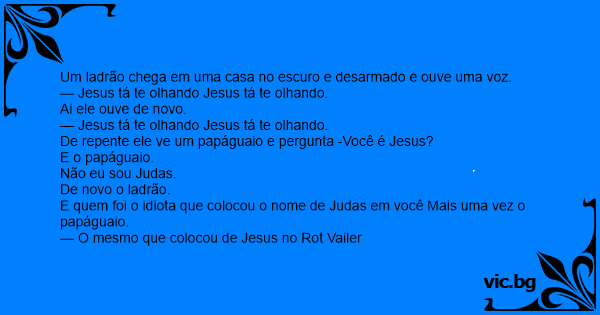Um ladrão entra em uma casa e já vai logo roubando tudo,quando ouve: — Jesus tá te olhando. Ele olha a sua volta e como não vê nada continua roubando. Mas logo depois ouve de novo: — Jesus tá te...