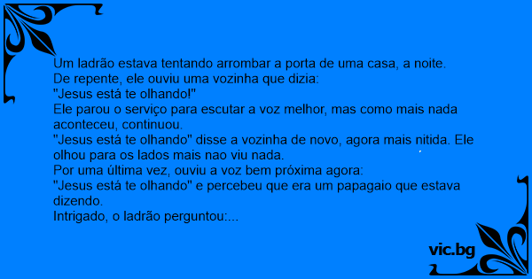 Um ladrão emtra para asautar uma casa ...ladentro ele ouve. .-Jesus esta ti olando! .Todo apavorado vai para o otro comodo.Derepente ele ouve denovo! .-Jesus `ta olando voçê!! .Assustado asende...