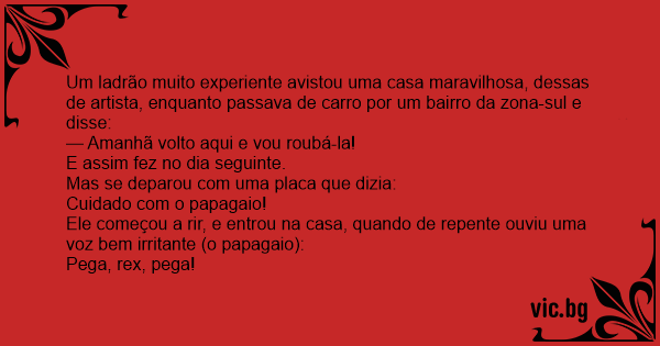 Ele começou a rir, e entrou na casa, quando de repente ouviu uma voz bem irritante (o papagaio):