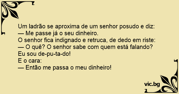 Пари Congressman's Money - Give me your money! - Това е обир, давай парите си! Грабитель на темной улочке останавливает одинокого пешехода: Late one night a mugger wearing a ski mask jumped into the path of a well-dressed man and stuck a gun in his ribs. Eines späten Abends in Berlin wird ein gut gekleidedter älterer Herr von einem maskierten Räuber überfallen: "Los, gib' mir all Dein Geld!" Empört gibt der ältere Herr zurück: "Das können Sie nicht machen! Ich bin Bundestagsabgeordneter!" "In diesem Falle", antwortet der Räuber, "gib mir MEIN... Un político se pierde en el camino. Entonces un ladrón se le acerca con una pistola y le grita: -¡Esto es un asalto, deme todo su dinero! -¿Pero acaso no sabe con quien se está metiendo? ¡Soy un político muy importante! -Ah...en ese caso, ¡devuélvame todo mi dinero! Dammi i tuoi soldi! Sono un politico Allora dammi i miei soldi Un ladrón coge a un hombre por la calle. - Deme todo su dinero. - Oiga, usted ni se imagina con quien está hablando. Soy un político muy influyente. El ladrón le mira y le dice: - En ese caso, devuelvame todo mi dinero. O ladrão foi assaltar um político: - Passa o dinheiro! - Calma! Calma! Eu sou deputado. - Ah, nesse caso! Passa o MEU dinheiro. A thief walks up to a man in a suit and pulls out a gun. The Thief says: “Give me your money.” The man in the suit turns around surprised. He raises his hands and says: “But, wait! You can’t do... Un rapinatore va da una persona e dice: "Dammi i tuoi soldi!" Ma lui risponde: "Ma io sono un politico!" E il rapinatore risponde: "Allora dammi i miei soldi!". Egy rabló pisztollyal megy az utcán. Meglát egy öltönyös gazdag embert ahogy kiszáll a BMW-ből. - Ez biztos nagyon gazdag.- gondolja. Odamegy a pisztollyal és elkiáltja magát! - Add ide a pénzed! -... Un ladrón a punta de pistola, se cruza con un tipo: - ¡Deme todo su dinero!. El hombre se sorprende, pero en lugar de asustarse lo increpa: - Oiga, usted no sabe con quién se está metiendo. Soy un... - ¡Esto es un asalto, déme todo su dinero! - ¿Usted no sabe que yo soy político? - Disculpe, entonces ... ¡déme todo mi dinero! Egy rabló megállít egy embert, és ezt kiáltja: - Ide a pénzt! Erre az ember: - No de kérem, én országgyűlési képviselő vagyok! - Ja az más. AKKOR IDE A PÉNZEM! Presretne pljačkaš sa fantomkom na glavi uglađenog gospodina u novom odelu: - Daj mi tvoje pare, odmah! Uplašeni gospodin diže ruke uplašen i kaže: - Ali, ja.. Ja sam političar. - A jel', onda mi...