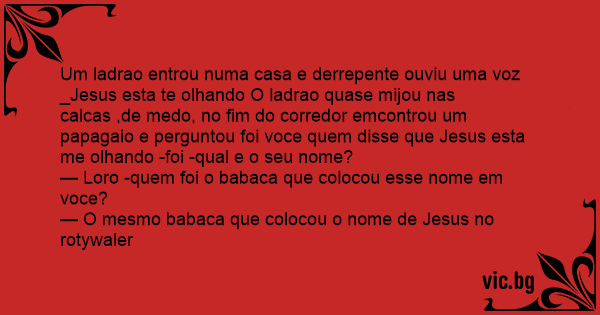 Um ladrão entra em uma casa e já vai logo roubando tudo,quando ouve: — Jesus tá te olhando. Ele olha a sua volta e como não vê nada continua roubando. Mas logo depois ouve de novo: — Jesus tá te...
