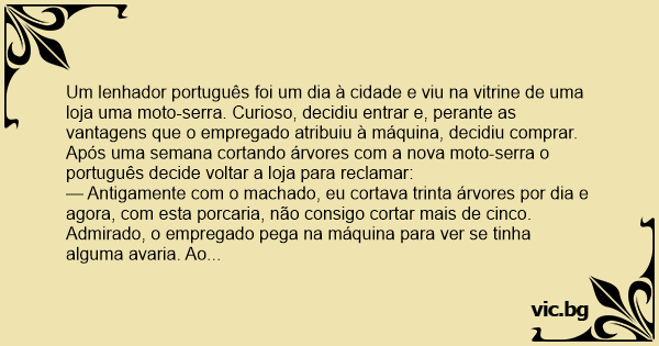 Um lenhador português foi um dia à cidade e viu na vitrine de uma loja uma moto-serra. Curioso, decidiu entrar e, perante as vantagens que o empregado atribuiu à máquina, decidiu comprar.